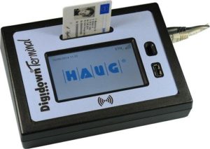 Das “Digidown Tag” Terminal ist speziell für die elektronische Führerscheinkontrolle konzipiert. Dieses Terminal liest RFID-Labels für die Führerscheinkontrolle aus und lädt diese Dateien auf einen FTP-Server Ihrer Wahl. Die Übernahme der Dateien vom FTP-Server kann z.B. automatisch mit der Tachonova FK1 Software vorgenommen werden.